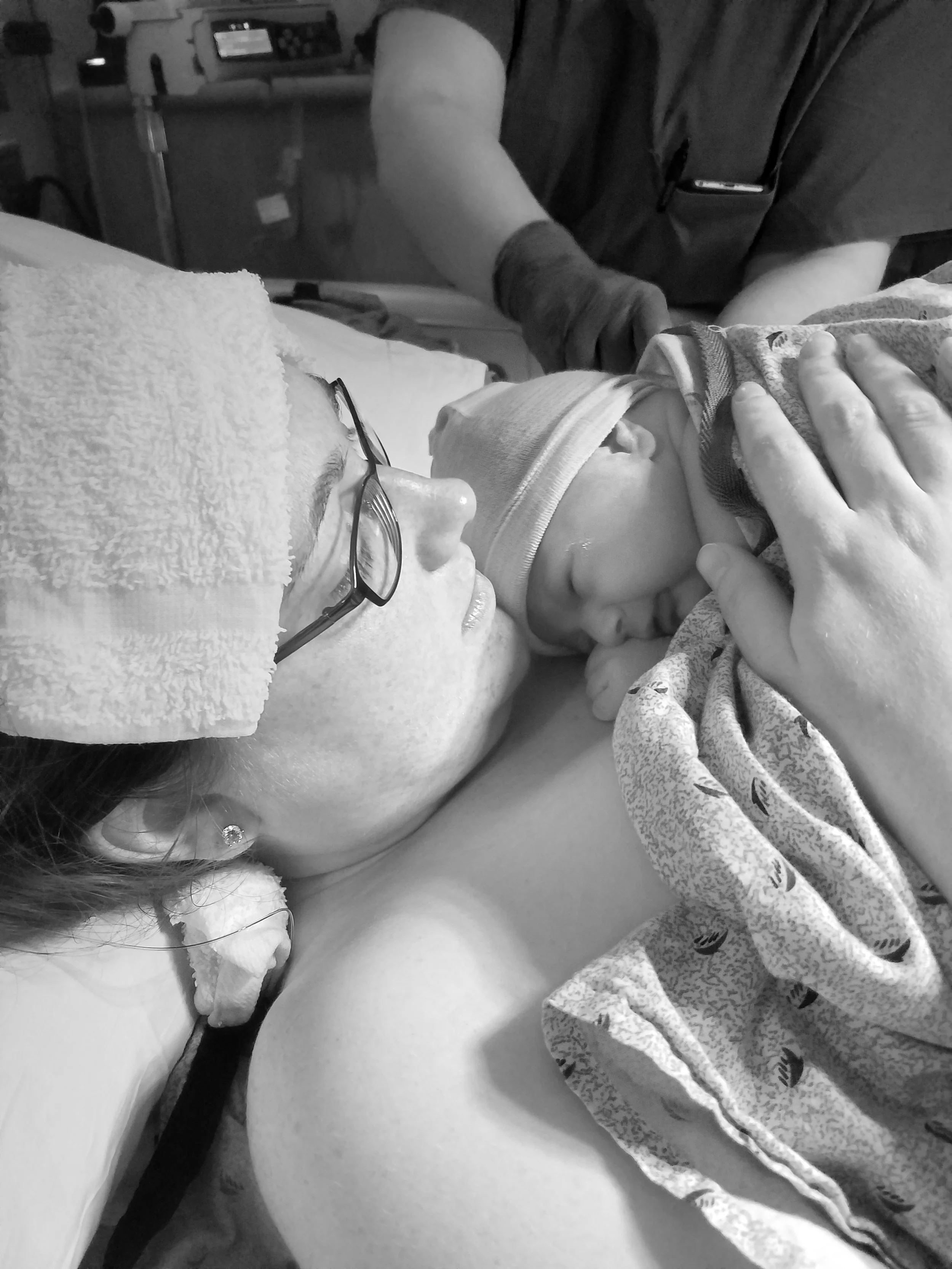 Finally at 3:00 am (yup that's an hour of hemorrhaging for those of you keeping track), things were under control enough for them to bring over the baby and place him on my chest. I was still being worked on, but it was no longer an emergency situation. From there, things normalized. We got to spend some time with baby E, the room cleared out a bit, and we got some time to just breathe and think about what would come next. At this point the only person we'd even told that I was in labor or we were at the hospital was Nicole. Everyone else was sleeping and completely unaware of baby E's arrival!