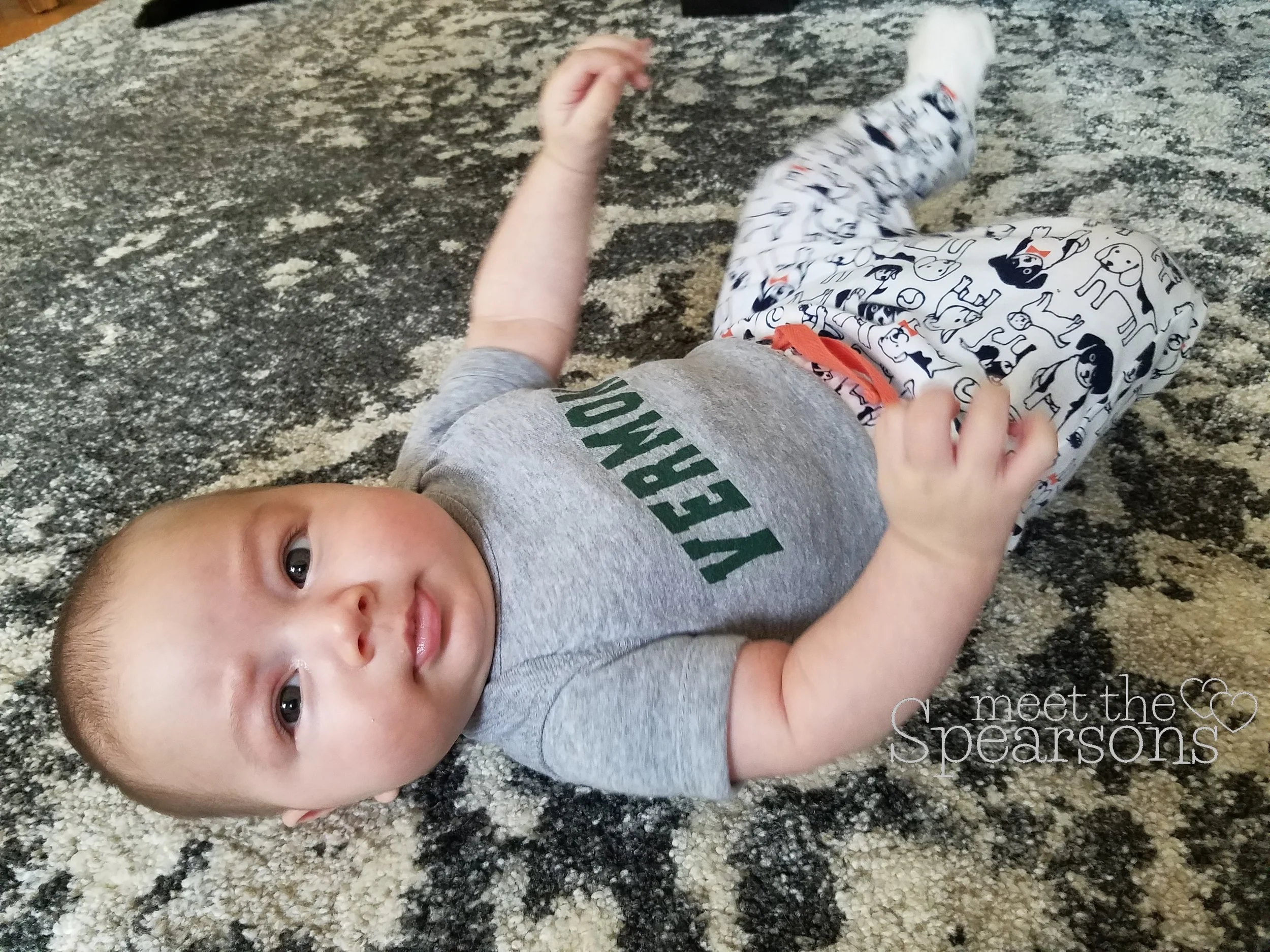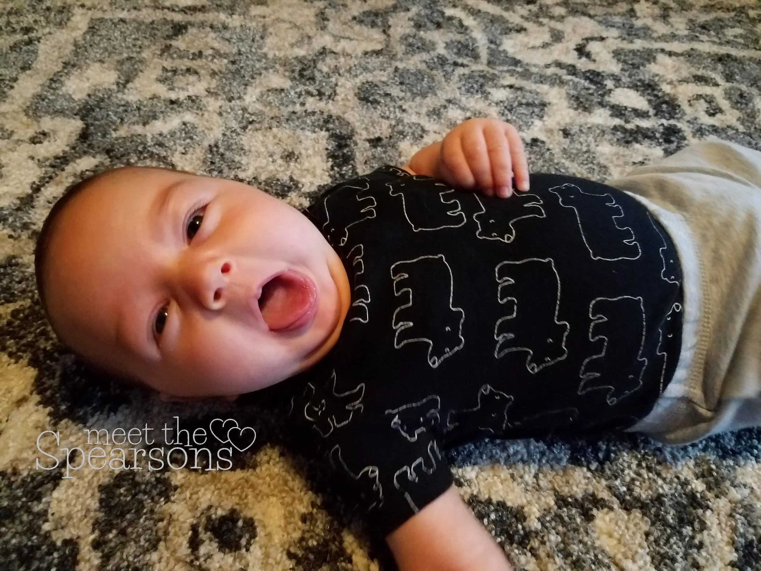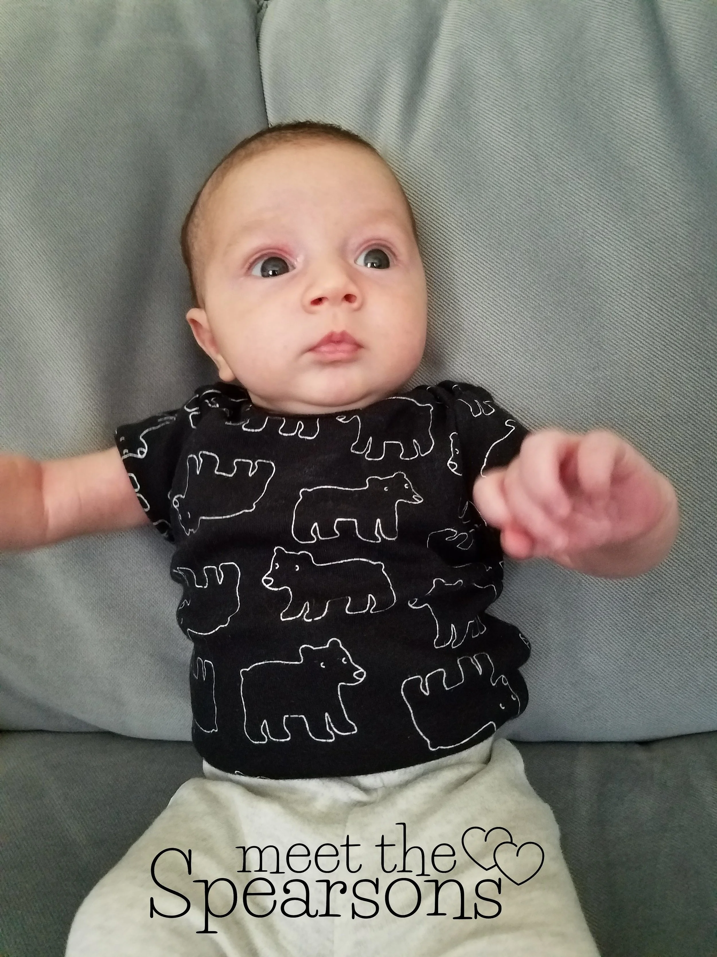 In the picture below, this is how he is these days. Comfortable here, more sure of himself, letting his goofy personality shine. And yes there are other differences, he has eyebrows now, his face is more rounded and filled out, and the bears on his shirt are a bit more stretched out now. But the personality is the biggest change.