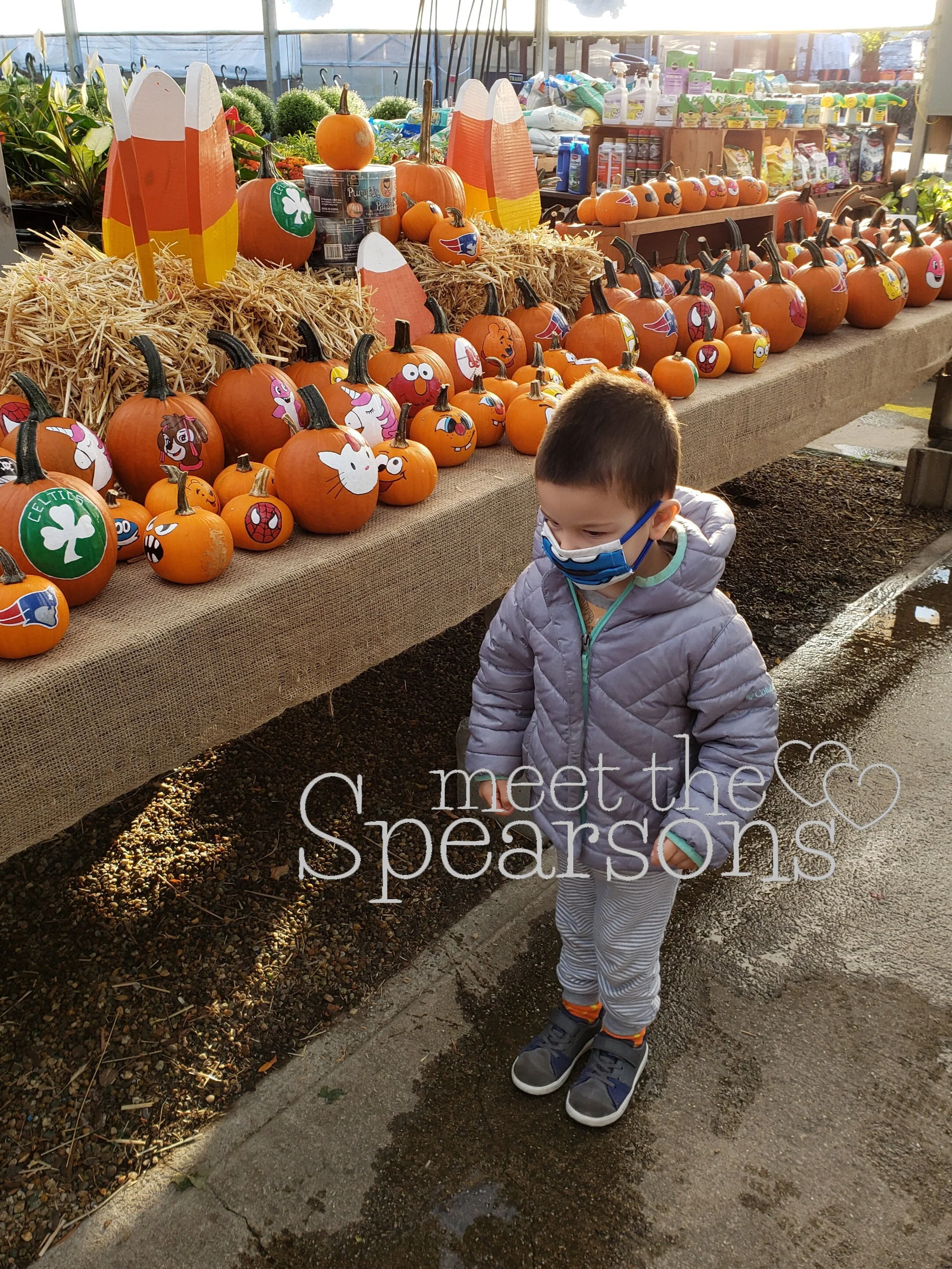 So we went first thing in the morning, and were the only people there. We ran around, picked out some pumpkins and took some pictures. I’m all about any activity that can feel a bit “normal” and still feel safe. E’s favorite part was all of the painted pumpkins for sale. He found a Cookie Monster one, and was super excited. G chose a baby shark one over an Elmo, which hopefully isn’t a bad sign for our coming Halloween costumes.