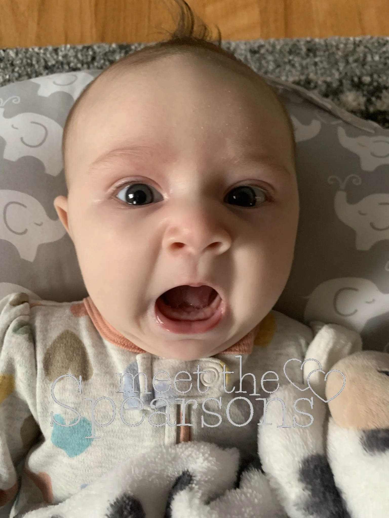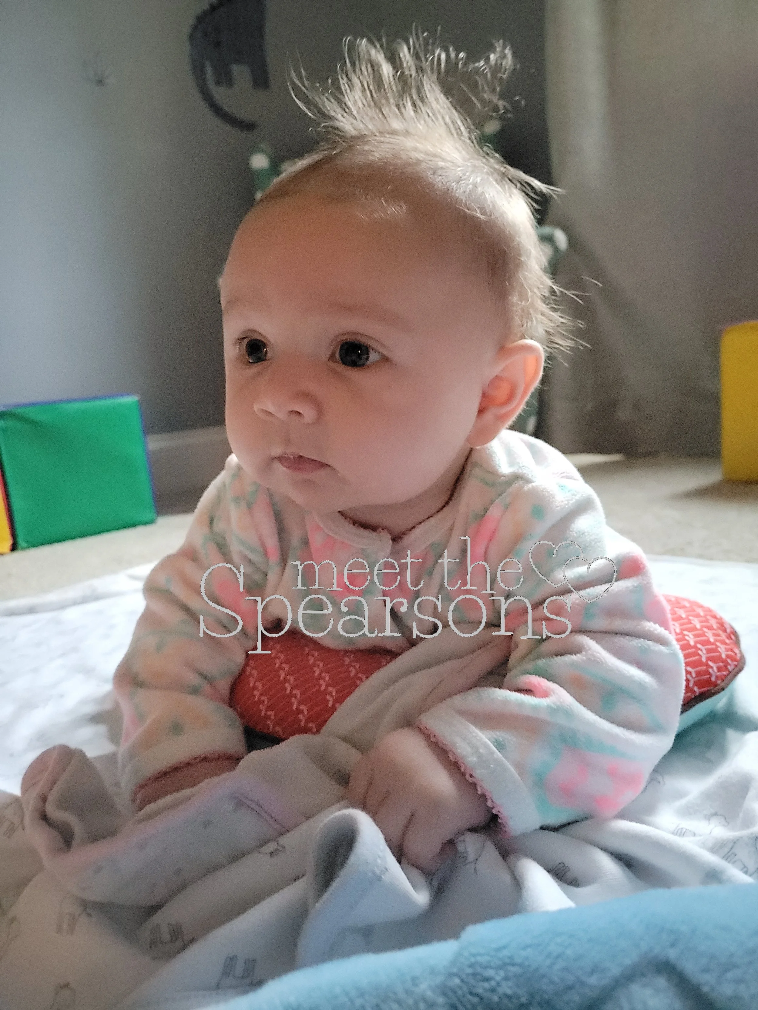 What a determined little baby you are. You’re not content with being a newborn anymore. You’re learning to roll and are working hard at sitting up too, when all we want is to enjoy you as a baby for as long as possible. You see your older siblings doing things, and you just want to be where they are. You love them so much, if you hear them you’ll crane your neck and move your body to try and see them. Of course they love you just as much, some nights you get a hug when Mama and Dad don’t.
