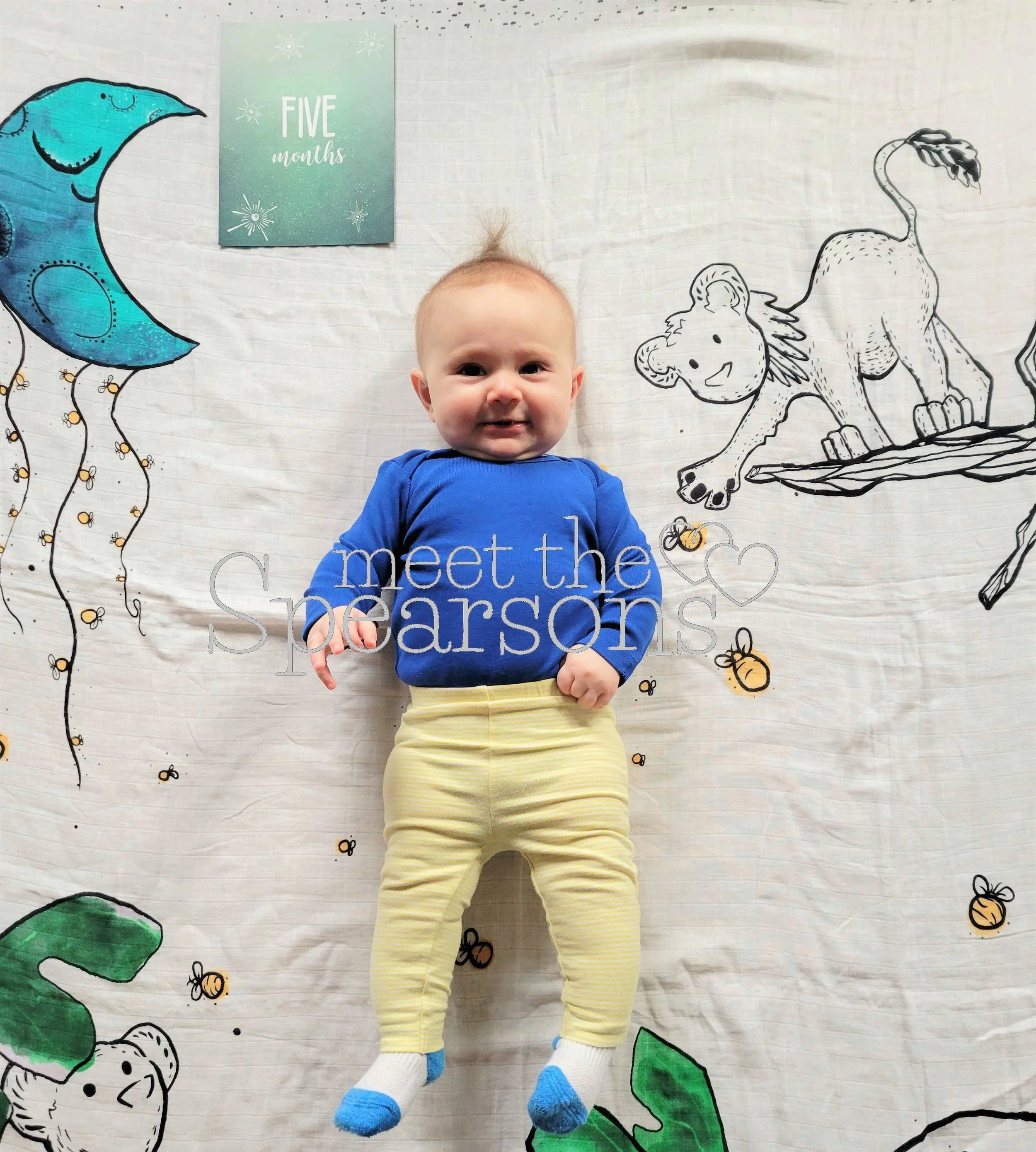 You’ve accomplished a lot this month. Rolling is easy for you now, but it’s not your favorite. You don’t do it a lot, and often when you do, it just makes you angry. But you can do it easily. You’ve also switched to mostly sleeping independently in the pack n play at night and for naps. Since we’ve done this before, we’re in no rush to get you there - we know it will come. So you still fall asleep on me at night, with your one hand wrapped up in my shirt. I’m savoring those snuggles for as long as I can, but also loving the small breaks we get while you nap. You also have tried a few foods this month, and while you’re still figuring out chewing and swallowing, your enthusiasm is there (except for banana - you hated banana).