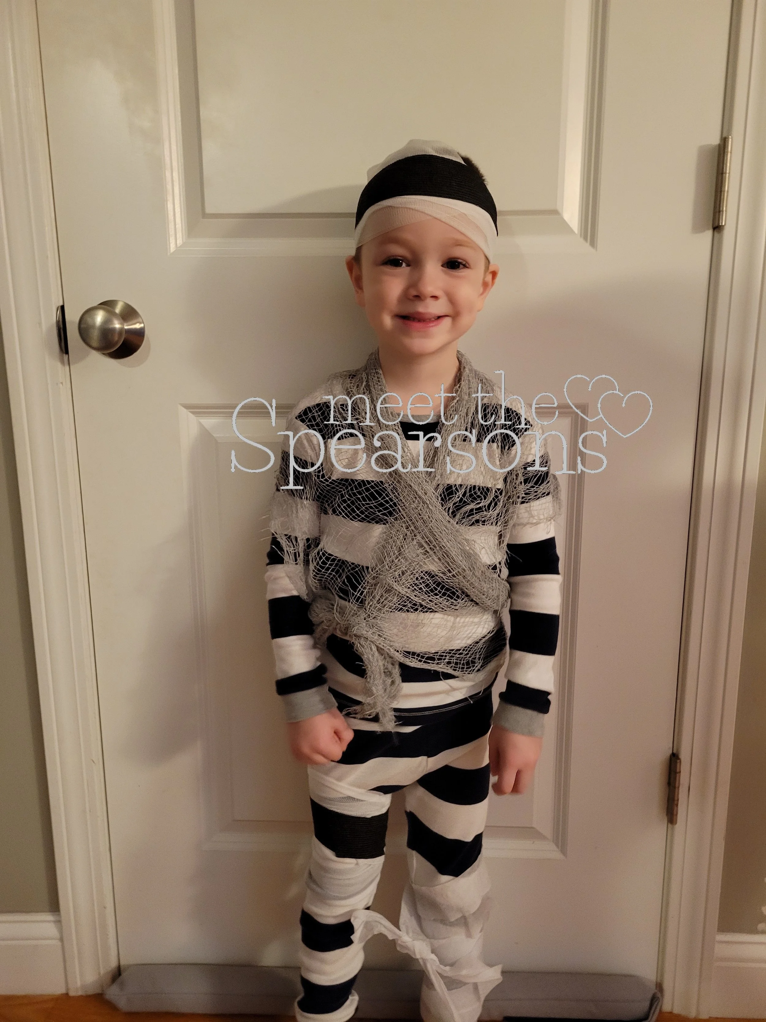 Daycare has been having a lot of theme days and other things that have been taking up a lot of extra time. It drives me crazy, but every once in a while something I didn’t expect excites the kids. Before Halloween, one of the theme days was dress like a mummy, and G thought it was the funniest thing as I bandaged him up.