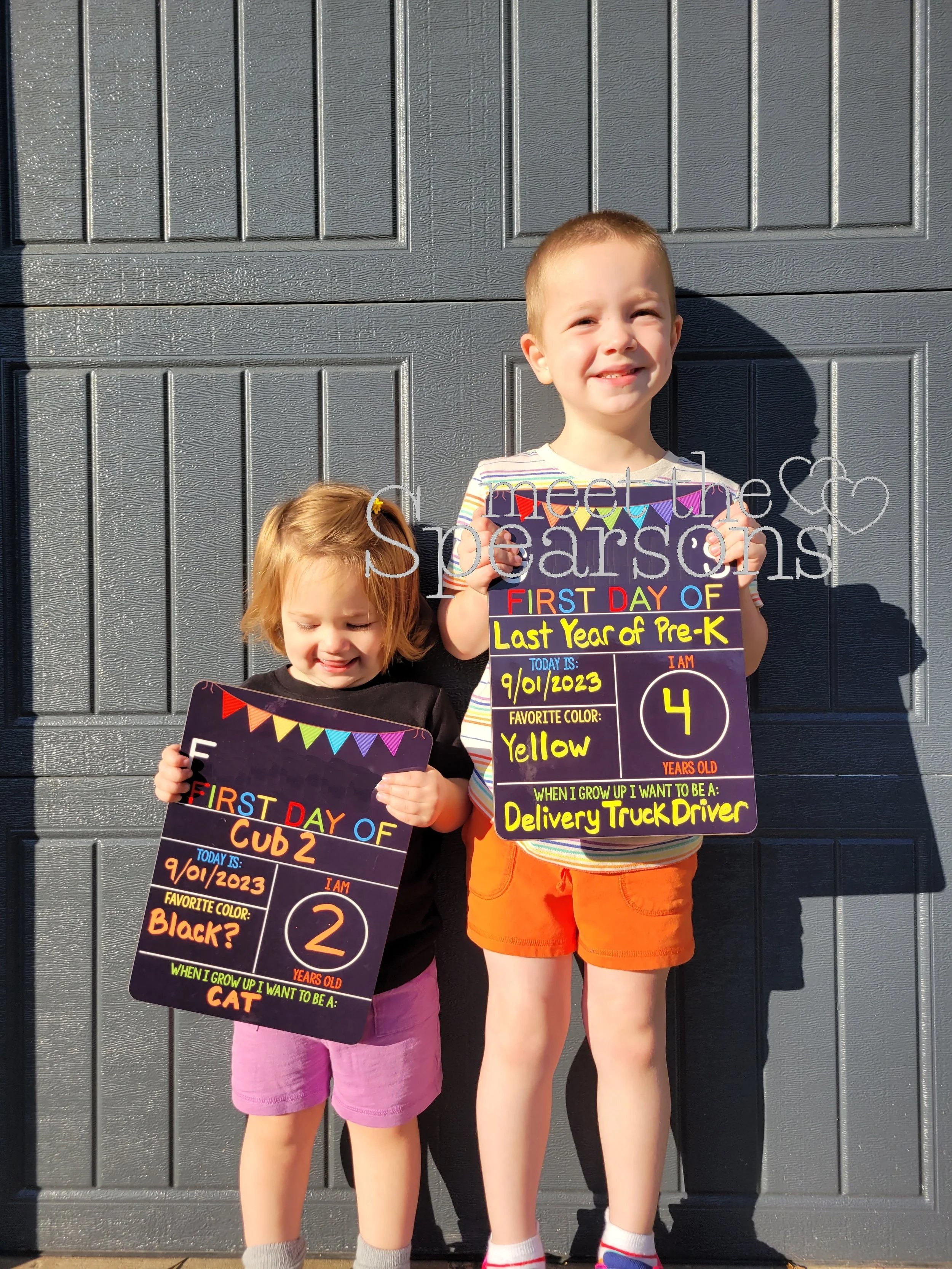 I took first day of school pictures the night before and on the actual day, due to rain in the schedule. The one from the day before certainly is prettier, but the one I took as we were waiting for the bus definitely shows the rawness of emotions we all had the morning of. We were all a bit nervous and a delayed bus didn’t help. However when I picked them up at the end of the day they jumped up and down and the first thing they said was: “I thought I was going to be scared all day but I wasn’t!”